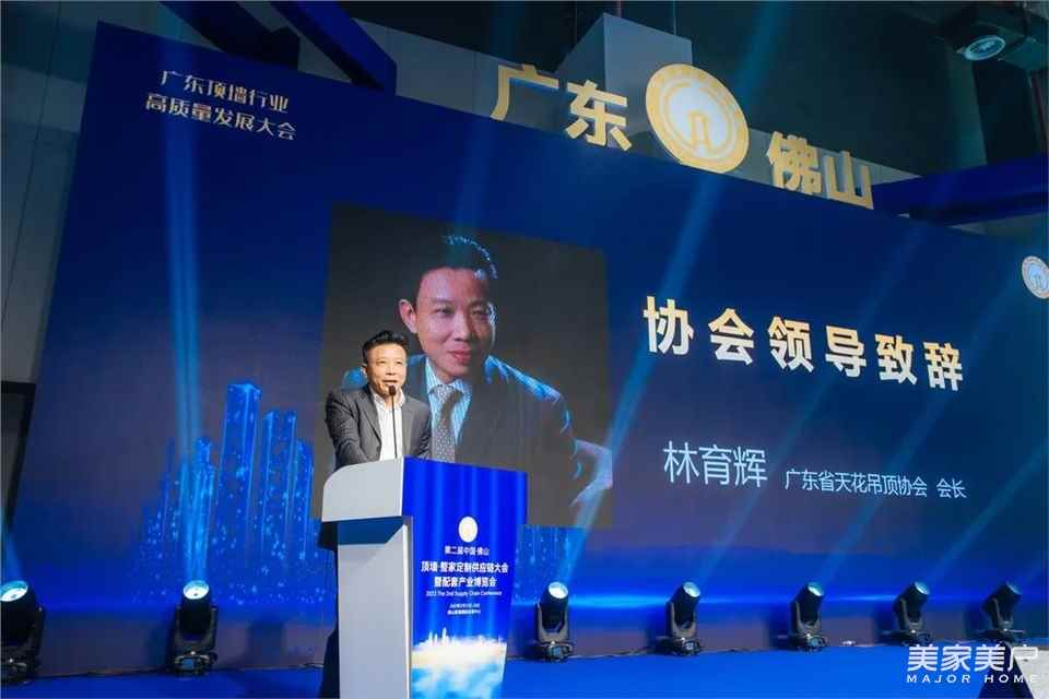 广东省天花吊顶协会会长林育辉在致辞时表示,党的二十大报告指出,要坚持把发展经济的着力点放在实体经济上,加快建设制造强国。国务院及相关部委发布了若干促进建材行业高质量发展的政策;今年,广东省政府召开全省高质量发展大会,强调“制造业当家”。种种信息表明,疫情过后,实体制造业将会引来更多的机遇和新的未来!协会将携手行业同仁,紧跟国家政策、坚定信心、积极迎接行业新的机遇和变局。