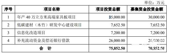 公司本次发行拟募资7.09亿元,募集资金将用于年产40万立方米高端家具板项目、低碳建材(木竹)研发中心建设项目、信息化改造项目、补充流动资金及偿还银行借款。