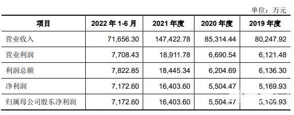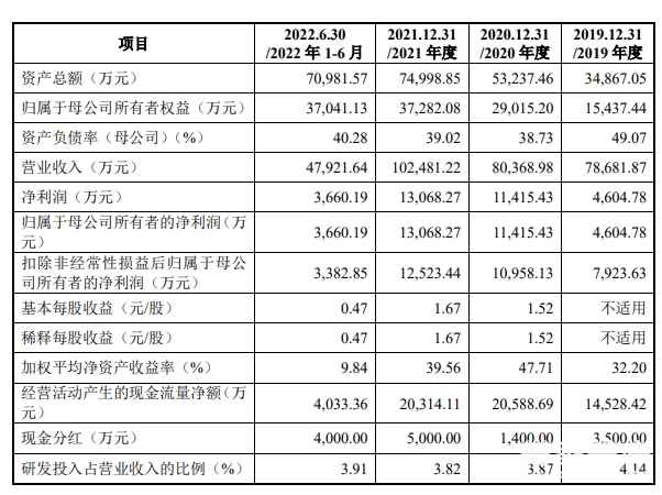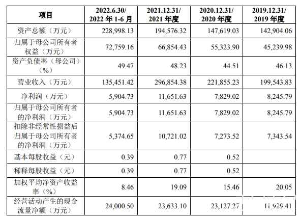 从财务状况方面看,报告期内公司盈利情况良好,2019年至2021年和2022年1-6月,公司分别实现营收7.87亿元、8.04亿元、10.25亿元和 4.79亿元;归母净利润分别为4604.78万元、1.14亿元、1.31亿元、3660.19万元。