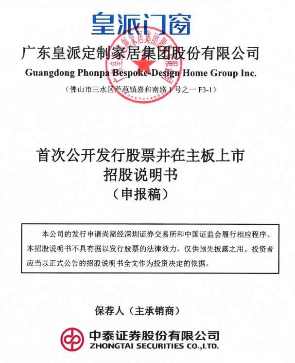 广东皇派定制家居集团股份有限公司(下称“皇派门窗”)拟登陆深市主板,公司本次向社会公众首次公开发行不超过 2,604.50 万股人民币普通股,占发行后总股本的比例不低于 25%,保荐机构为中泰证券。