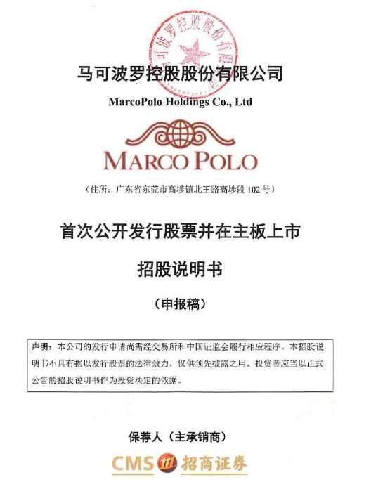 马可波罗控股股份有限公司(下称“马可波罗瓷砖”)拟登陆深市主板,本次公开发行股票的数量不超过11,949.2万股(未考虑超额配售选择权的情况下),本次发行数量占公司发行后总股本的比例不低于10%,公司保荐机构为招商证券。