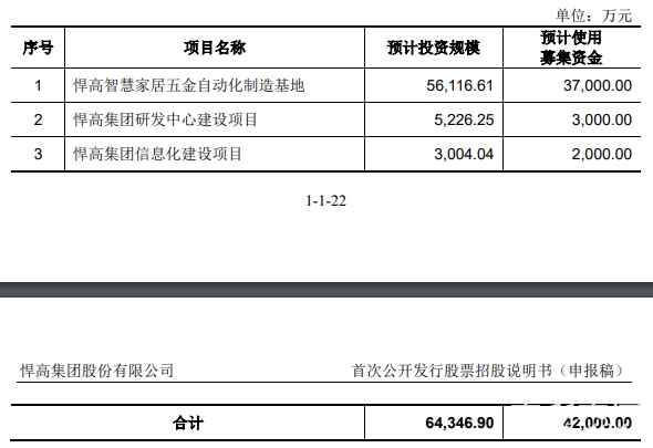 IPO全面注册制落地后,公司按照相关规定重新提交深市主板IPO申请。据最新招股书,悍高五金拟募资6.43亿元,预计使用募集资金4.2亿元,募资资金将投入悍高智慧家居五金自动化制造基地、悍高集团研发中心建设项目等。