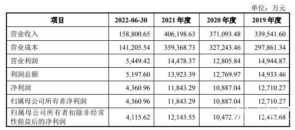 从财务数据来看,2019年至2021年、2022年1-6月,公司营业收入分别为81.30亿元、85.91亿元、93.65亿万元和42.25亿元,净利润分别为 16.28亿元、15.74亿元、16.53亿元和7.44亿元;主营业务毛利率分别为 47.11%、43.80%、43.09%和35.54%。