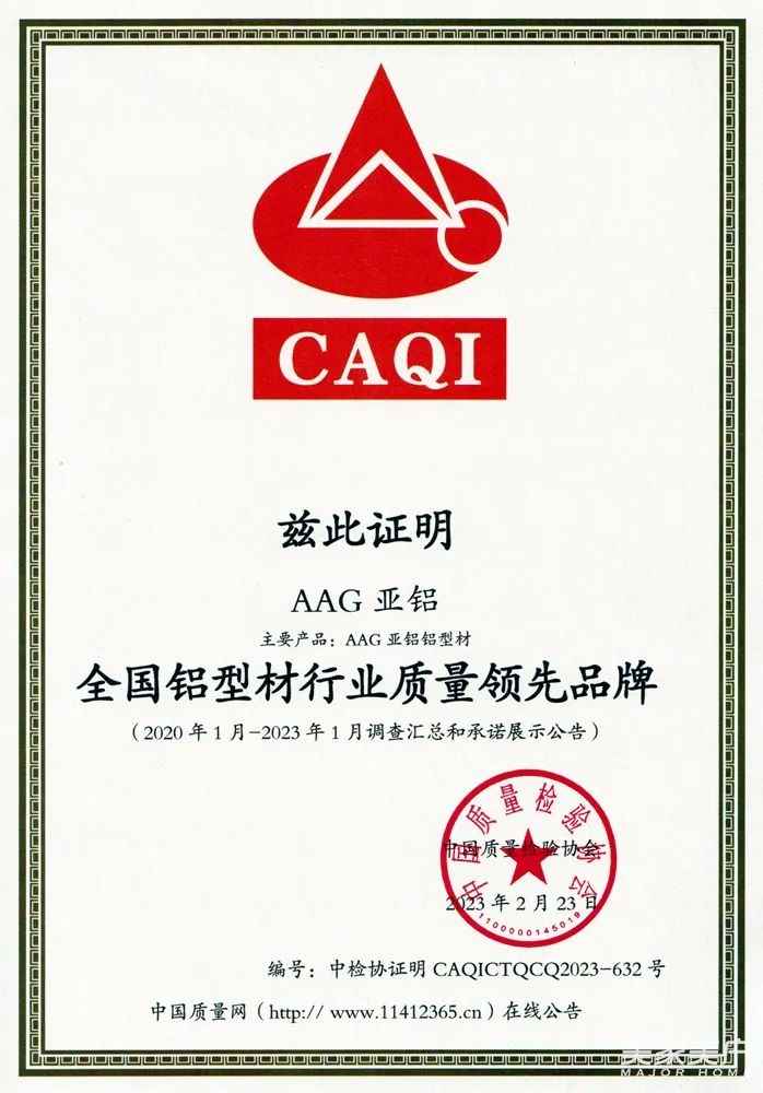 近日,由中国质量检验协会授权认证。AAG亚铝凭借过硬的产品质量与诚信经营的企业理念连获2020—2023年“全国产品和服务质量诚信品牌”和“全国铝型材行业质量领先品牌”两项荣誉,又一次用质量和诚信鉴证了品牌实力,诠释了我司的“多元化服务”内涵!事实上,亚铝从2002年起正式获评“国家质量稳定合格产品”到2023年保持“全国质量诚信领跑品牌”,至今已在全国质量标杆之路问鼎21年!质量就是我们企业的命脉线,质量就是我们所向披靡的产品力!