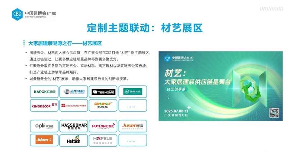 材料和工艺是行业创新的源泉。中国建博会(广州)顺应行业创新需求,突破以往对材料、五金等供应链题材的分散布局,新设立以“材料”和“工艺”为展示核心要素的“材艺”主题展区,强化上游材料、五金企业与下游定制家居、成品企业之间的交流互动,系统地汇聚和展示大家居建装行业完整供应链、生态链。