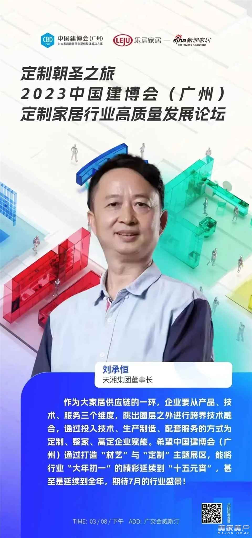 3月8日,中国建博会(广州)联合新浪家居,在广交会威斯汀酒店隆重举办“【定制朝圣之旅】2023中国建博会(广州)定制家居行业高质量发展论坛”,并举办了2023中国建博会(广州)“定制朝圣之旅”启动仪式。论坛汇聚了众多定制家居企业领袖,深度探讨行业在新阶段如何协同多元渠道力量,推动定制家居行业高质量发展,天湘集团董事长刘承恒受邀参与盛会。