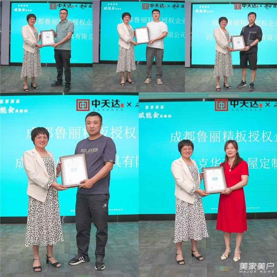 会议现场,主办方举行了鲁丽精板的授权仪式,中天达木业创始人邵建兰为获得经营权的商家颁发了授权书。