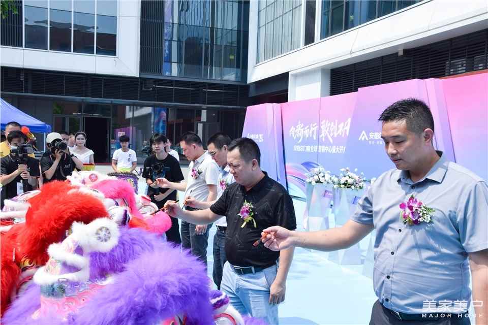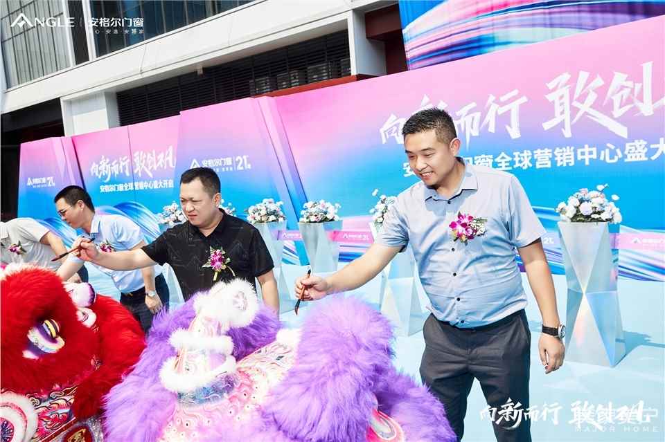 伴随着醒狮队伍的华丽登场,安格尔门窗董事长罗汉标、安格尔门窗总经理罗汉池、安格尔门窗副总经理罗益祖、安格尔门窗营销总经理宋海鹏上台为醒狮点睛,锣鼓齐鸣、雄狮舞动、舞狮点睛,高处采青.....现场一片欢腾。