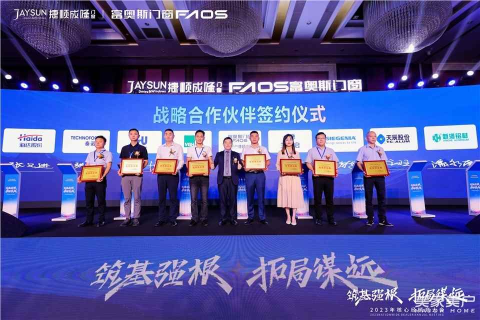 大会上,富奥斯还与江阴海达橡塑股份有限公司、泰诺风保泰节能科技(深圳)有限公司、格屋贸易(上海)有限公司、德国威必驰集团上海威必驰五金有限公司、兰光启智能门窗控制系统、丝吉利娅奥彼窗门五金(三河)有限公司、济南天辰智能装备股份有限公司、广东新合铝业新兴有限公司分别签订了战略合作协议,并颁发了优秀供应商牌匾。后续,双方将展开深入合作,共同打造更好的产品品质和更高性价比的产品。