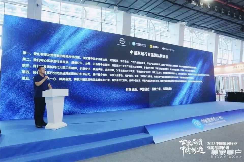为积极响应国家号召,进一步展现中国企业实力和水平,提振中国信心,彰显文化自信,推动中国家居行业品牌高质量发展,协会与行业领军企业共同发起中国家居行业强国品牌倡议,北京霍尔茨家居科技有限公司总经理赵崇联代表企业宣读倡议。在与会来宾的共同见证下,大会隆重发布了“2023年中国家居行业强国品牌”。