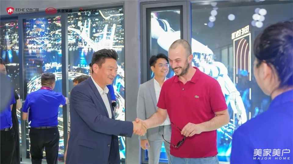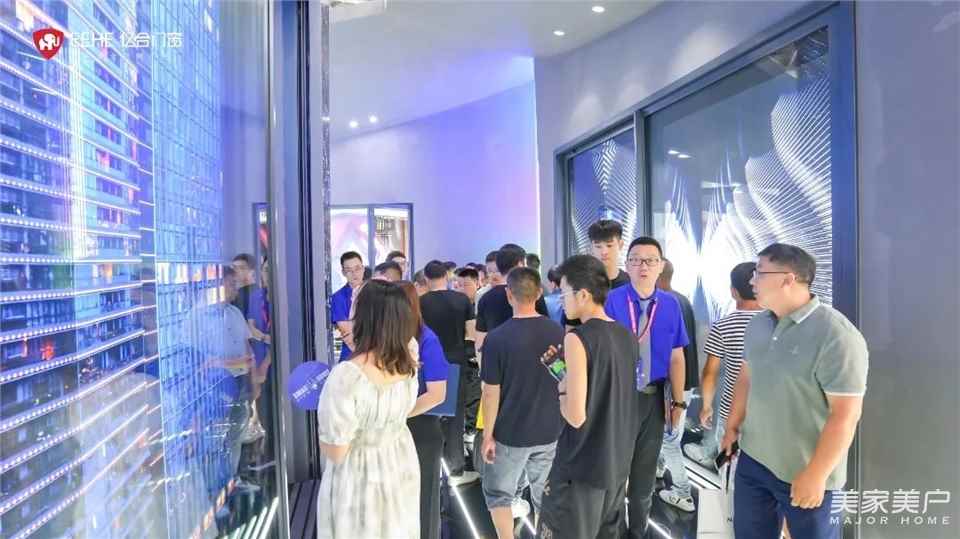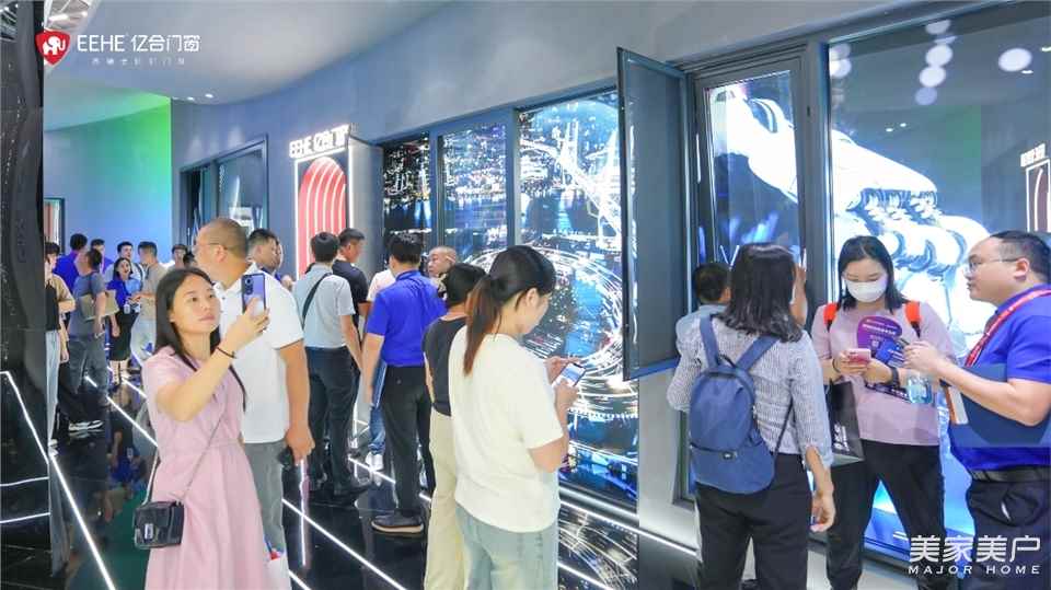 展会精彩不断,人潮络绎不绝。亿合门窗此次带来全新设计展厅瞩目全场,整体主色调采用高端中性灰与魅力科技蓝和谐搭配,外观造型通过窗框与亿合盾牌IP形象的糅合运用,交织成一个科技美感与现代轻奢并存的生活体验空间。以沉浸式体验的空间构建模式,增强了参观者的代入感和互动感,吸睛指数爆表。