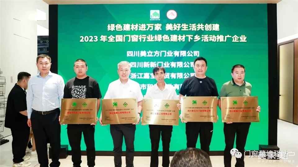 首先颁发了2023全国门窗行业绿色建材下乡活动推广企业,此次获牌企业是:群升门窗股份有限公司、四川兴事发门窗有限责任公司、江山欧派门业股份有限公司、新多集团有限公司、德阳凯达门业有限公司、辽宁雨虹门窗有限公司、广东坚美铝型材厂(集团)有限公司、万嘉集团有限公司、浙江金凯德安防科技有限公司、浙江金和美工贸有限公司、浙江金迪门业有限公司、北京伯艺创美科技有限公司、河北胜达智通新型建材有限公司、河北日上建材制造有限公司、春天集团有限公司、四川美立方门业有限公司、四川新新门业有限公司、浙江嘉宝工贸有限公司、成都市和乐门业有限公司、浙江巨腾工贸有限公司
