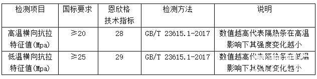 隔热条在高温或则低温下进行检测,对于检测设备及工艺都有极高的要求,大多数的同类厂家都无法提供相关的检测,恩欣格自有的检测中心都能提供相关的检测。以恩欣格24mmC型隔热条为例,“GB/T23615.1-2017”国标要求为标准, 恩欣格隔热条不仅能满足“高温横向抗拉特征值” ,而且也能满足“低温横向抗拉特征值”。具体参数如下: