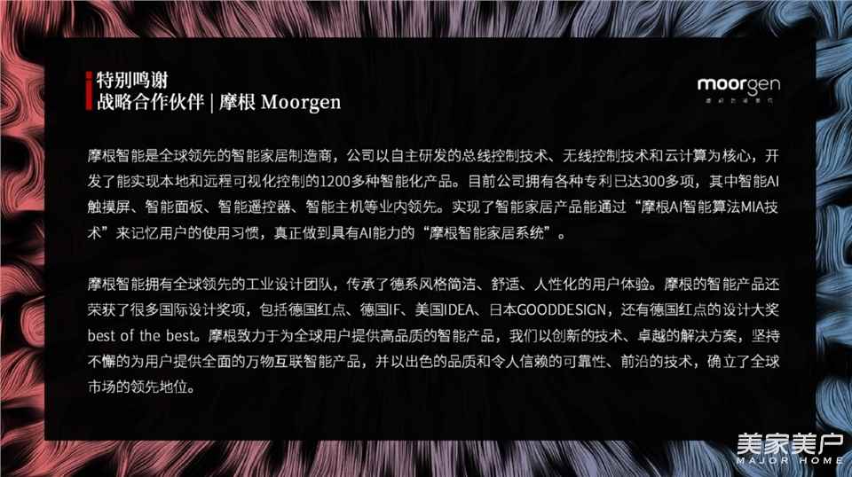 作为智能家居的领军品牌,摩根全屋智能拥有全球领先的工业设计团队,产品设计带来简洁、舒适、人性化的用户体验。目前拥有各种专利已达300多项,其中智能AI触摸屏、智能面板、智能遥控器、智能主机等业内领先。实现了智能家居产品能通过“摩根AI智能算法MIA技术”来记忆用户的使用习惯,真正做到具有AI能力的“摩根全屋智能系统”。