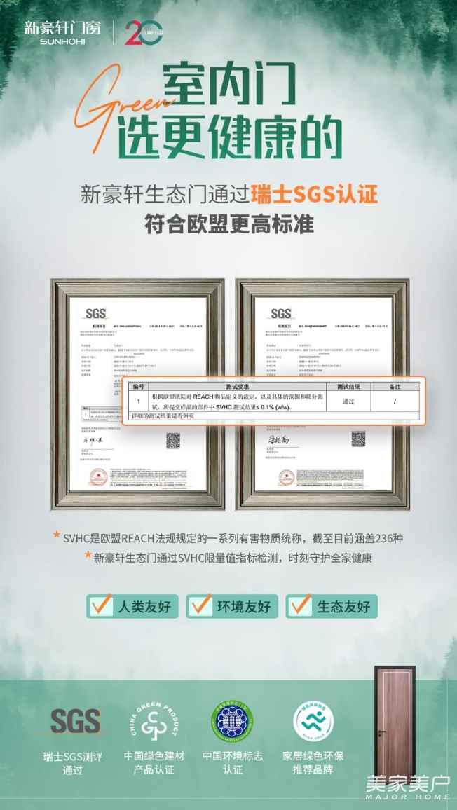 而通过瑞士SGS认证和中国绿色建材产品认证的新豪轩生态门,SVHC≤0.1%(w/w),以符合欧盟更高的标准,为消费者提供绿色、环保、健康的室内门,为打造绿色生态家园提供更多解决方案。