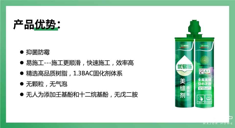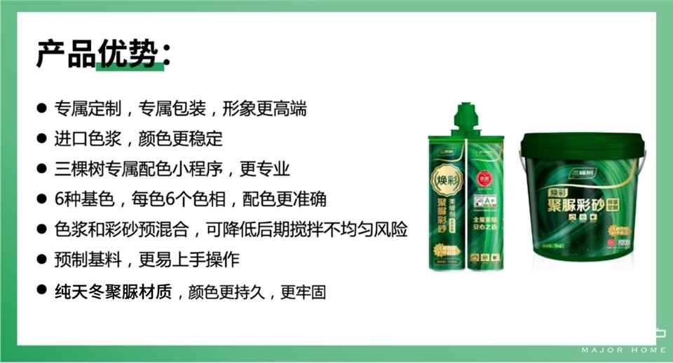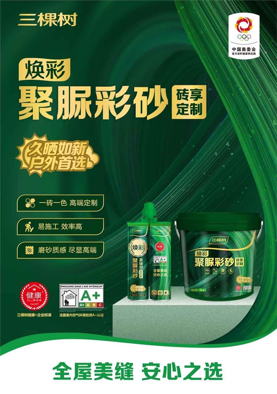 三棵树始终坚持产品的环保标准,创造健康、绿色的居住环境。焕彩聚脲彩砂美缝剂新品通过健康+、法国A+标准,纯天冬聚脲材料、安全环保又健康,为客户健康生活提供坚实后盾。