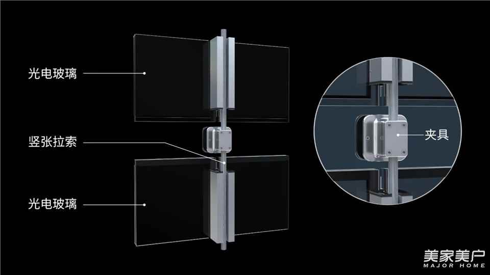 光电玻璃面板和连接件之间设置侧向旋转的耳板支座,以保证光电玻璃和侧面收口发生相对转动。