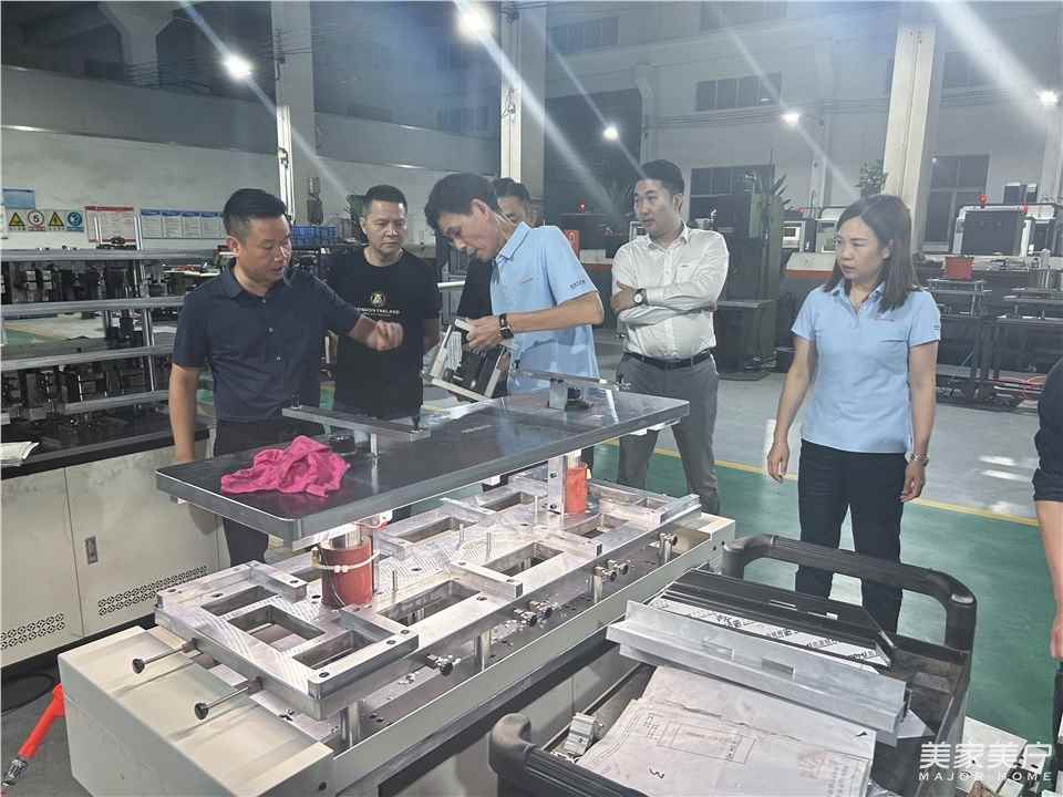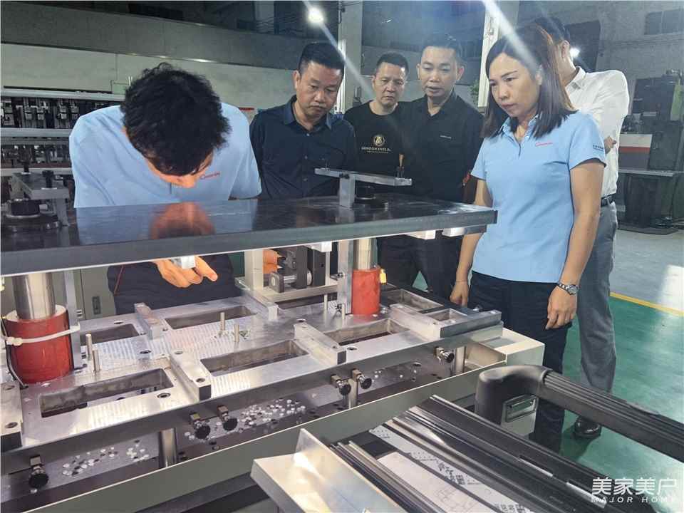 在参观过程中,黄国强董事长带领派雅门窗副董事长李钧海、广东省门业协会饶德亮一行走进生产车间,并详细介绍了佛山市金利丰模具机械有限公司的产品之一高精密液压莫具冲床,黄国强介绍:模具工位的前端增加了进料导向模块,入料时更便捷及顺畅;模具采用优质的耐磨钢材,并使用真空热处理以发挥材料的最佳性能;模具工件使用CNC 加工,以达到更高的工件加工精度;模架增加顶罩和防护挡板,能更好地保护操作人员,减少安全隐患;前后防护挡板上标注了每个工位对应加工的型材截面,操作时一目了然。