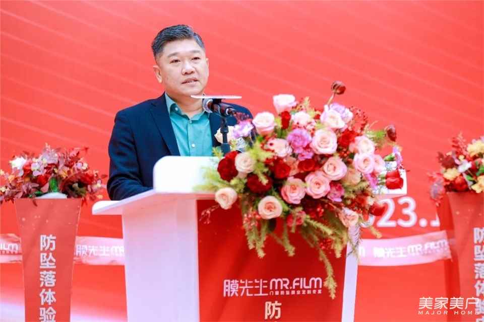 佛山市膜先生新材料科技有限公司董事长王浩杰向大会作致辞,感谢各级领导和同仁们莅临现场,并对膜先生的革命性产品玻璃隔热防坠落安全门窗膜作详细介绍。