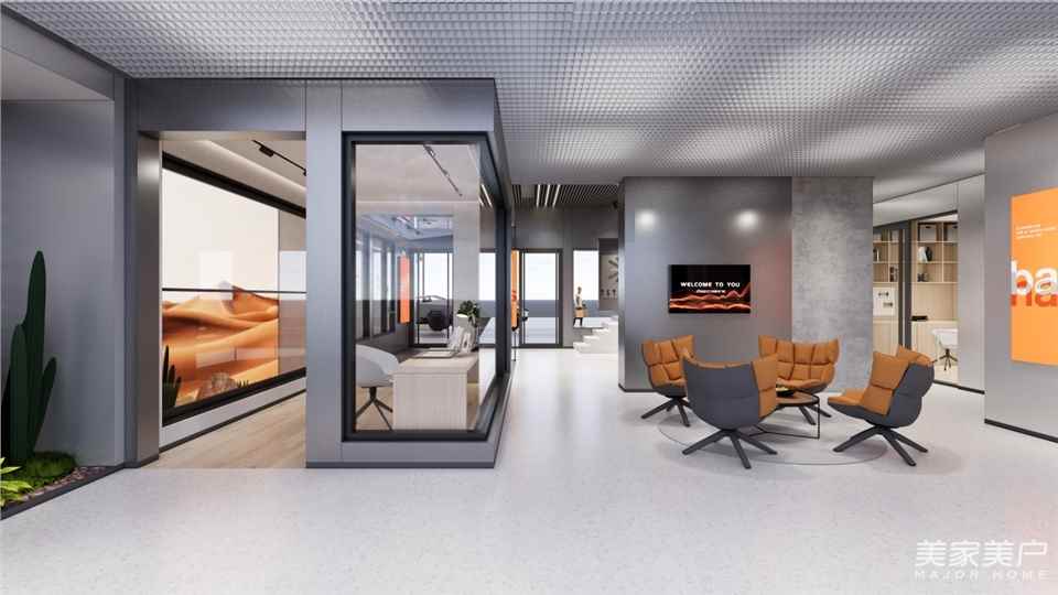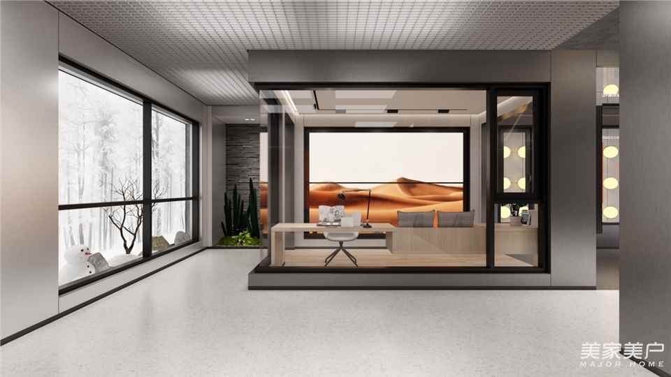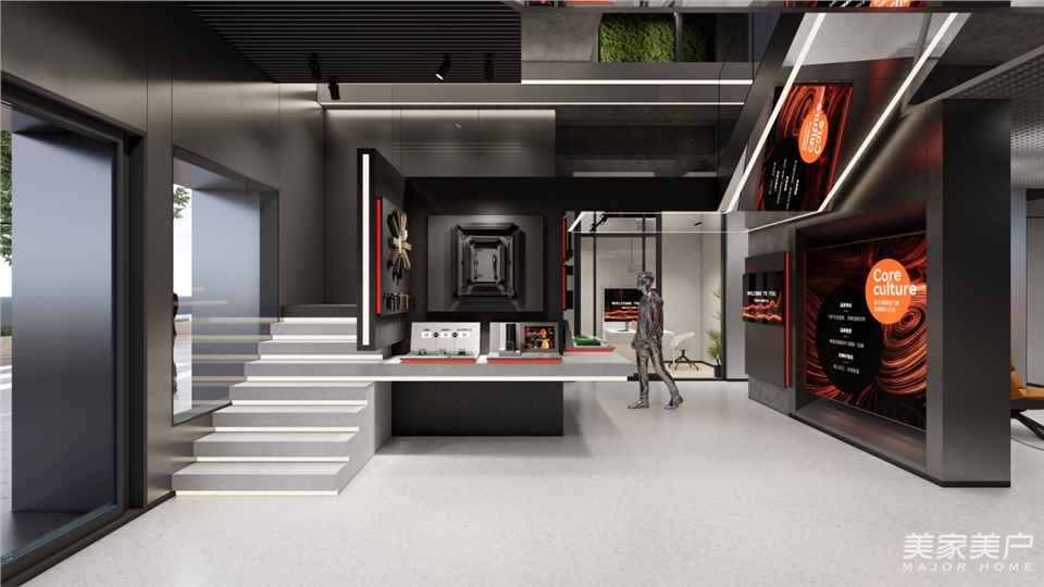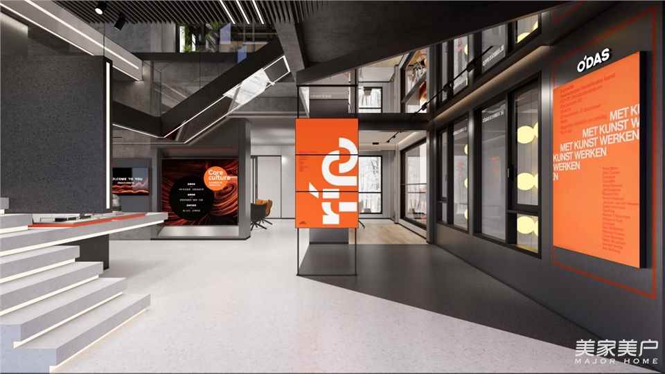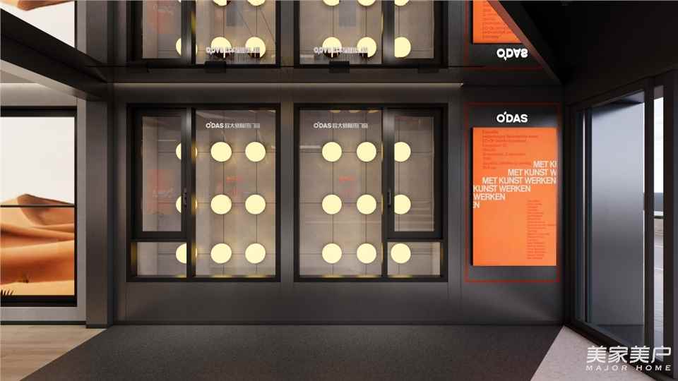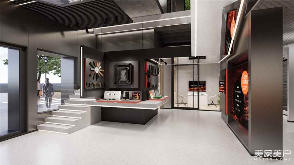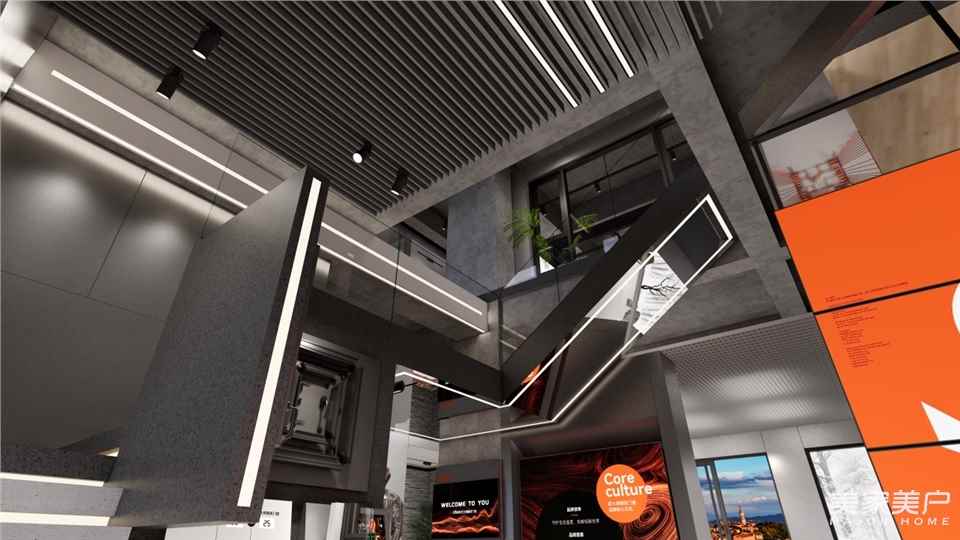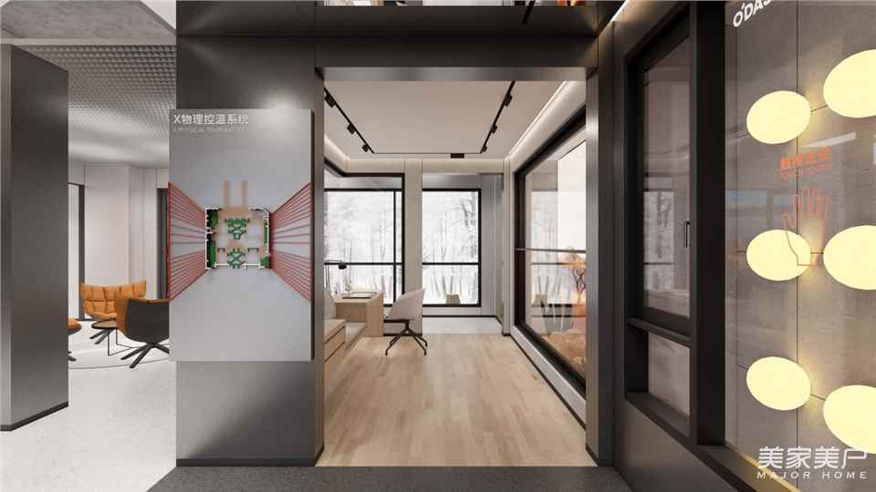 两层中空开放式的空间构造,更显空间感与建筑立体感。在具有更高可利用率的前提下,进行品牌调性色彩的运用、工法区的科技感、产品展示与场景设置,以实现技术、艺术与生活的和谐统一,彰显欧大师隔热门窗的美学理念。