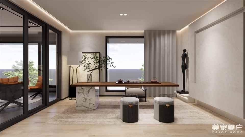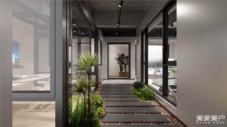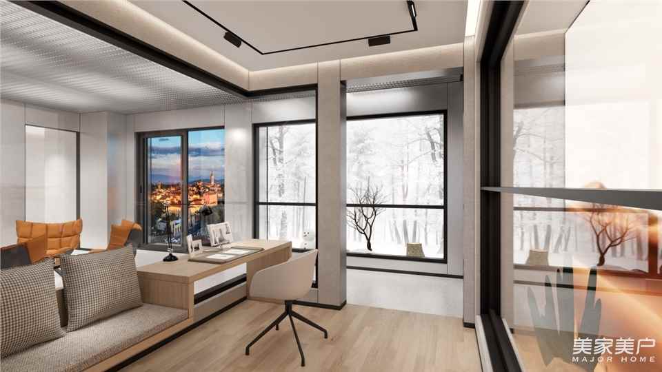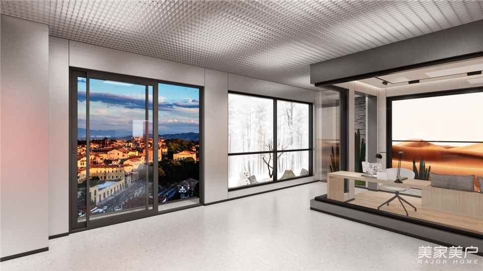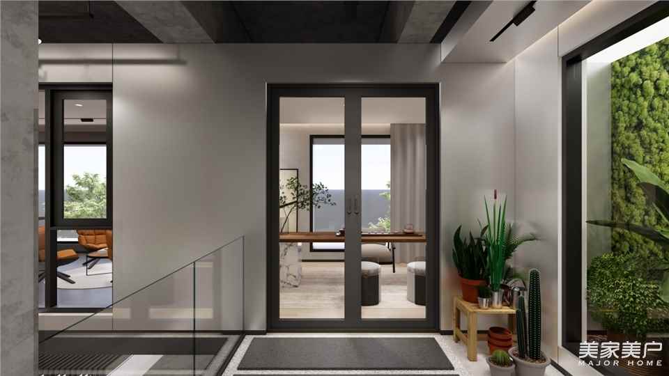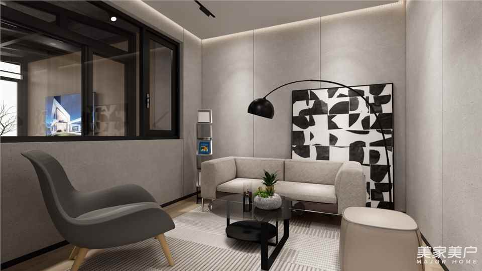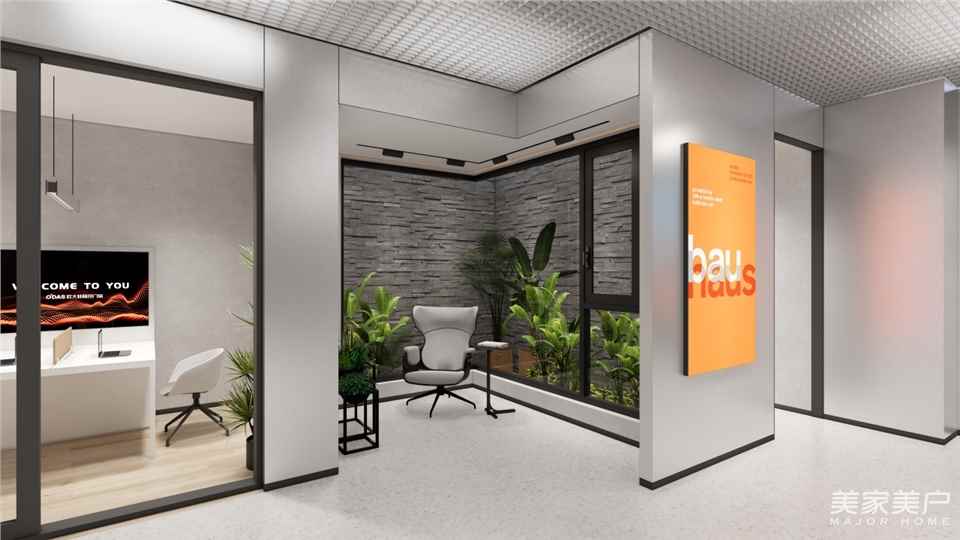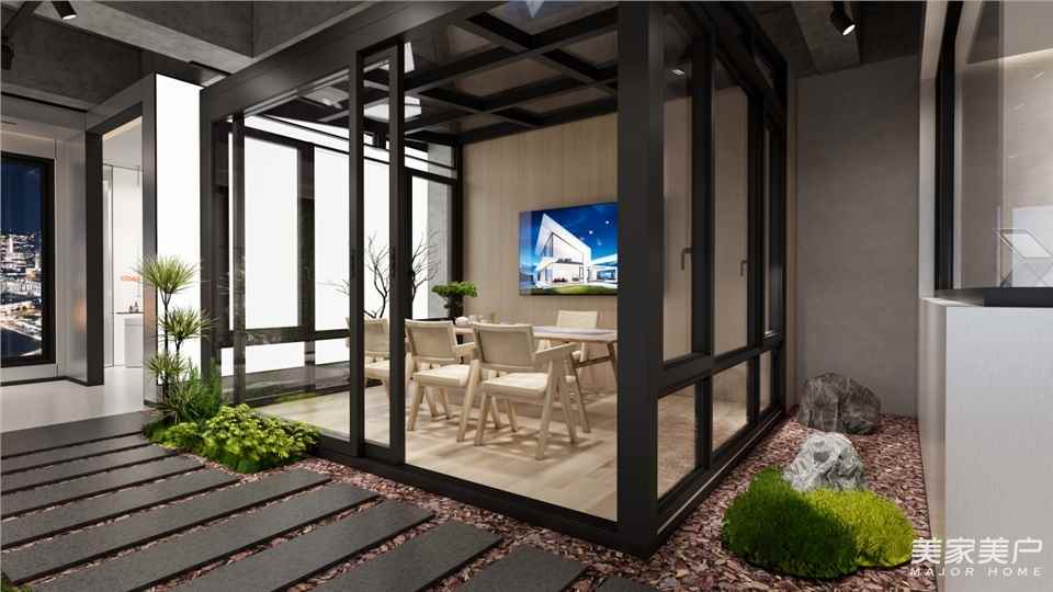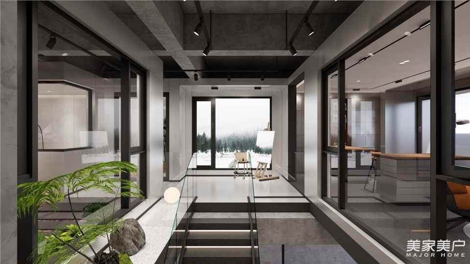 两层中空开放式的空间构造,更显空间感与建筑立体感。在具有更高可利用率的前提下,进行品牌调性色彩的运用、工法区的科技感、产品展示与场景设置,以实现技术、艺术与生活的和谐统一,彰显欧大师隔热门窗的美学理念。