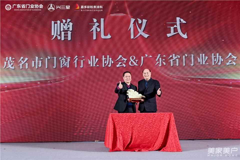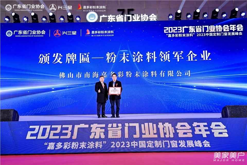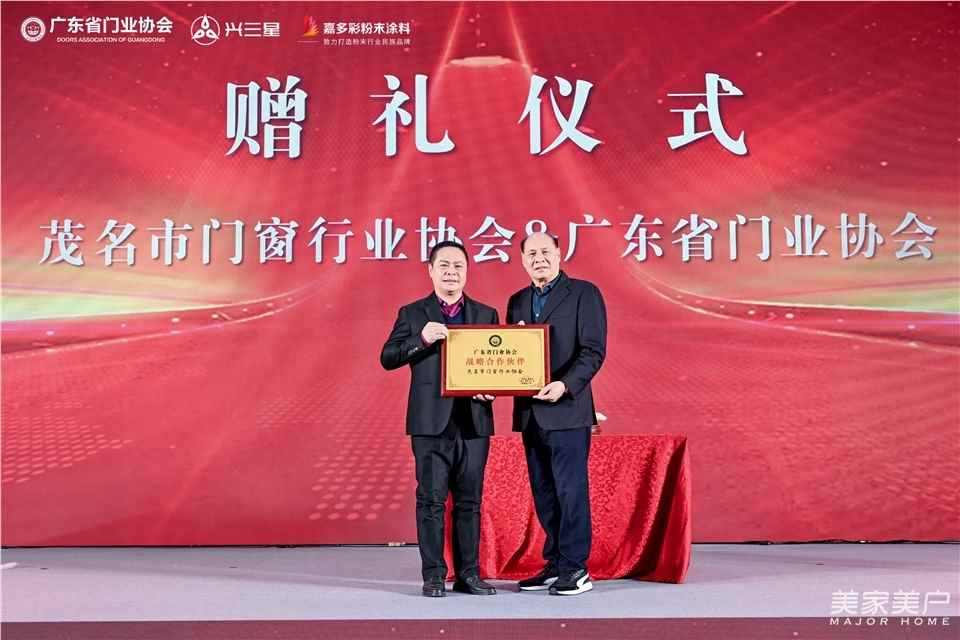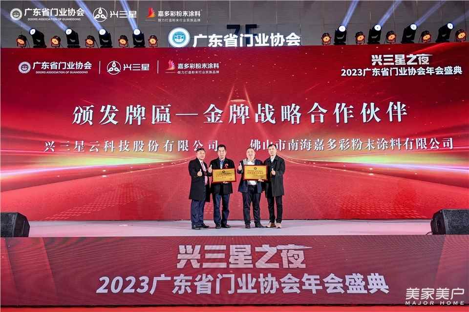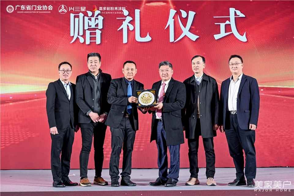 随后,广东省门业协会会长李钧洪,分别为兴三星云科技副总裁陈玮琦、嘉多彩粉末涂料总经理李文岳,颁发了“总冠名”“分冠名”单位荣誉牌匾。