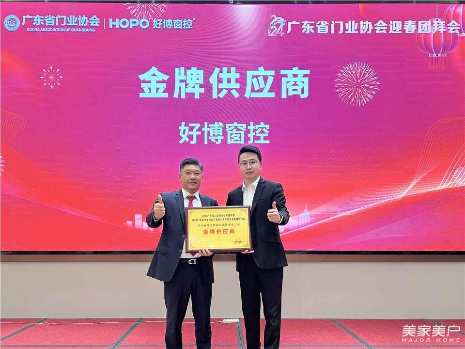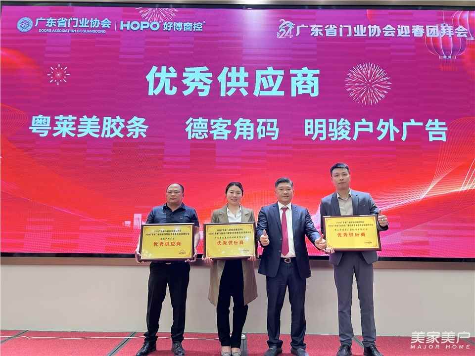 在颁奖典礼环节,广东省门业协会会长、派雅门窗董事长李钧洪,为好博窗控颁发了“金牌供应商”荣誉证书,为粤莱美胶条、德客角码、明骏户外广告颁发了“优秀供应商”荣誉证书。