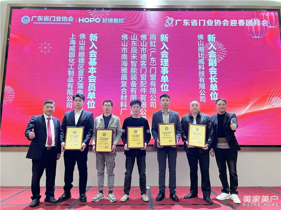 随后,广东省门业协会会长、派雅门窗董事长李钧洪,广东省门业协会执行会长、新豪轩门窗董事长冯文波,共同为新入会副会长单位、佛山市瀚必威科技有限公司;新入会理事单位:雨虹(广东)门窗有限公司、佛山市德客门窗配件有限公司、山东辰禾智能装备有限公司、佛山市南海雅晨复合材料厂;新入会基本会员单位:佛山市顺德区意艾蒲电器有限公司、上海威固化工制品有限公司,颁发了荣誉牌。