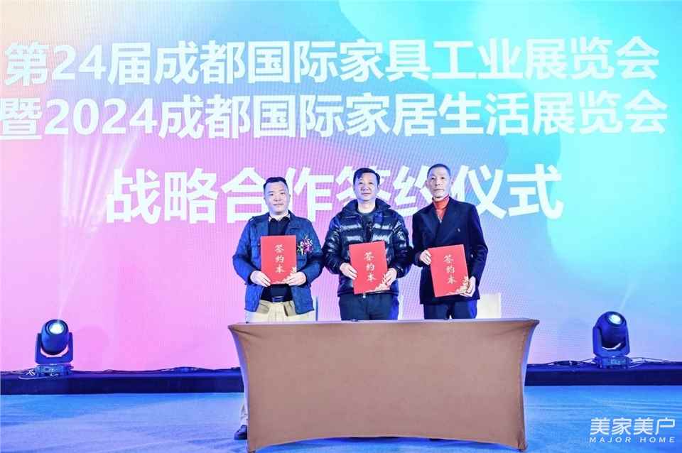 在此次盛会上,四川省家具进出口商会发布了一系列关于四川家具未来的发展战略,其中最受关注的2024年家居展会迎来了重磅签约!第24届成都国际家具工业展览会与2024成都国际家居生活展览会正式签署战略合作。成都新东方展览有限公司执行董事、总经理姚剑,四川省家具进出口商会执行秘书长荣煜伟,成都国腾展览策划有限公司总经理张凯在现场成功签约。