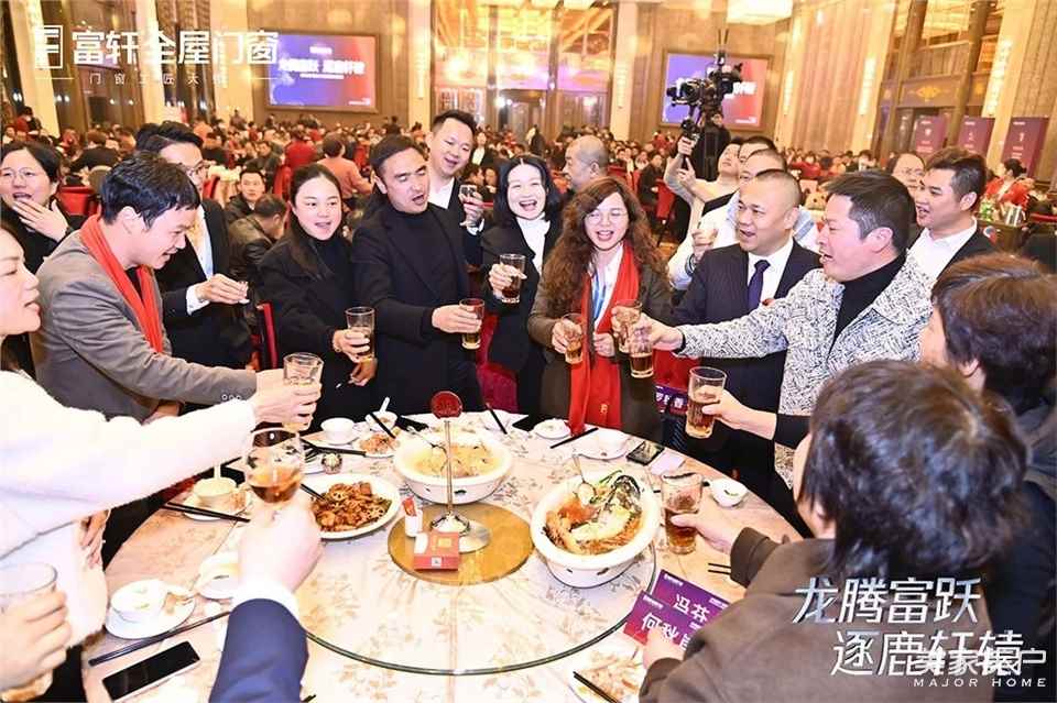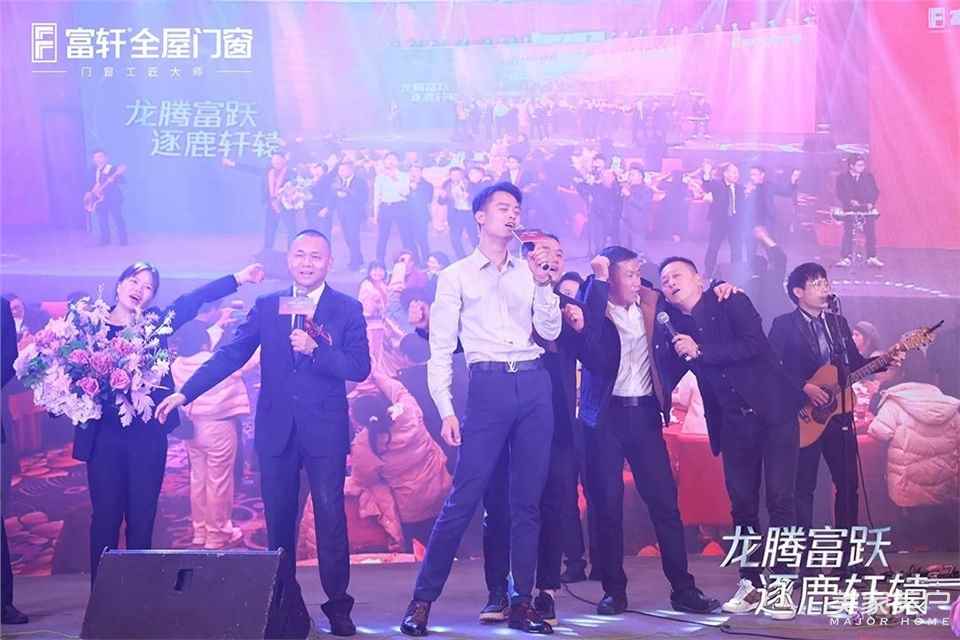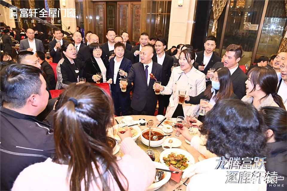 富轩全屋门窗董事长李董带领公司高层领导以及与会嘉宾们到场庆贺,众人开怀畅饮,畅享相聚之乐,尽飨美食佳肴,现场热闹温馨,其乐融融。各种极具观赏性的文艺演出轮番上演,还有潮流乐队热歌暖场,精彩纷呈,场内到处都是家人们的欢声笑语和鼓掌声。