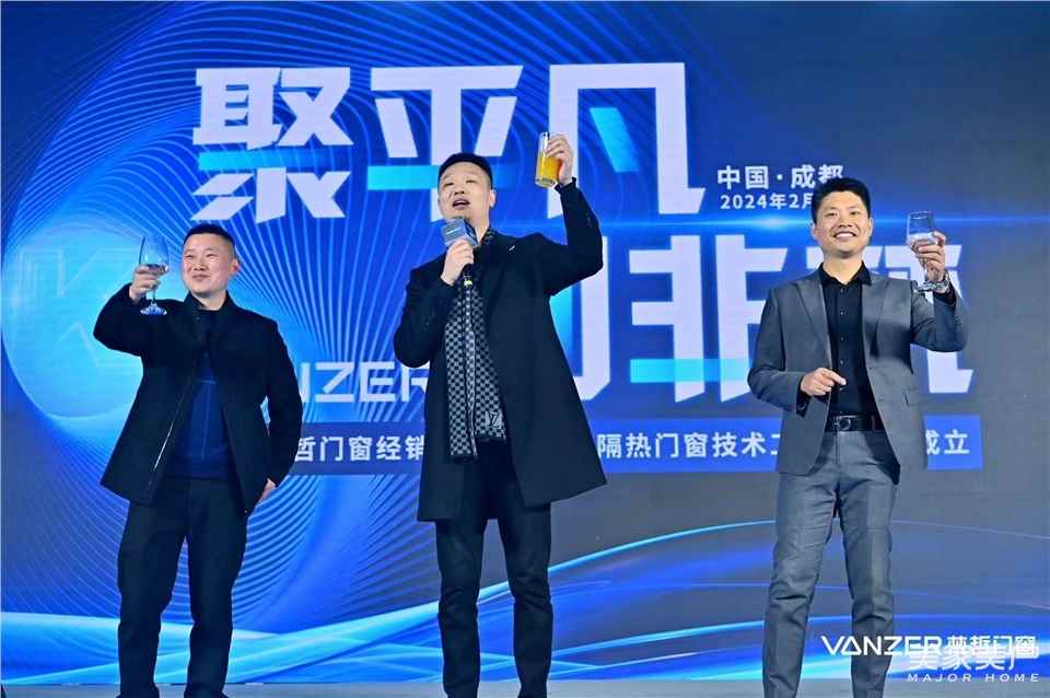 期间,梵哲门窗总经理杜涛云、副总经理梁玉成、营销总监张小虎等公司管理层登台祝酒,寄语大家2024年生意兴隆!龙行龘龘!