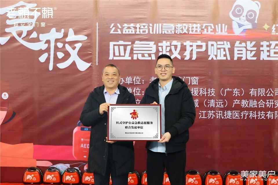 鹰鹏应急救援科技(广东)有限公司总经理、红式守护公益项目发起人庄嘉鹏为老赖不赖超安全门窗董事长赖世佑授牌“红式守护公益急救志愿服务联合发起单位”