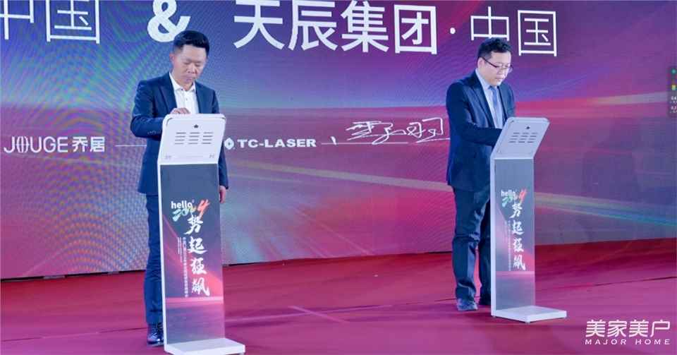 不仅如此,乔居在产线布局上进行了大踏步推进,与天辰集团达成战略合作,引进AI智能设备,开始智能车间打造。峰会上,董事长卢礼威先生与山东天辰设备营销总监傅旺先生进行了签约。AI智能车间的打造,不仅整体上提升了产品质量和生产效率,且对于促进提高居住建筑的舒适性,有效改善资源浪费问题,促进绿色环保产生了重要意义。