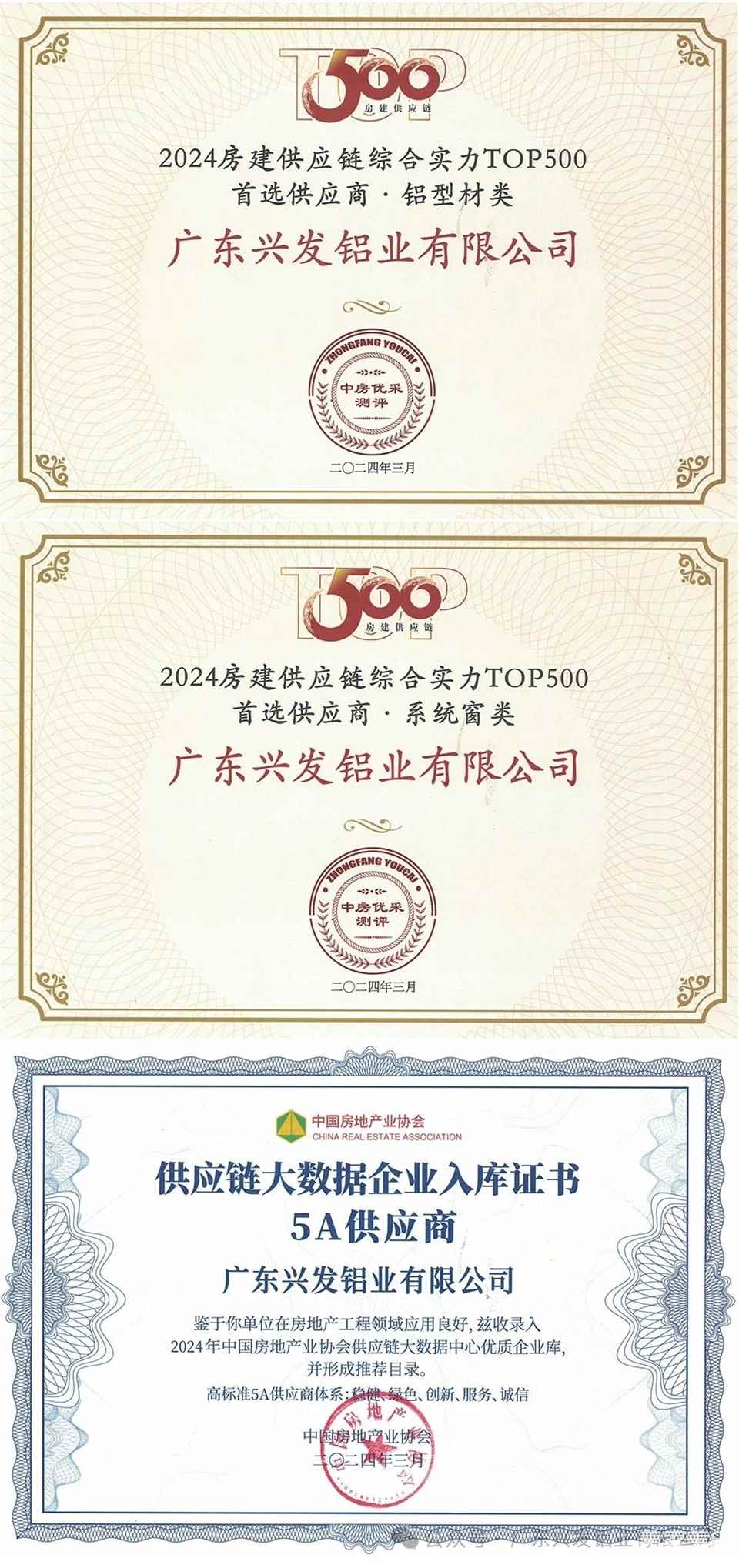 “兴发铝材”和“兴发系统”荣膺“2024房建供应链综合实力TOP500首选供应商品牌”十强榜单,入选“5A供应商”企业库