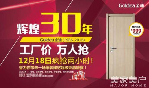 今年是金迪木门创立的第30个年头,从只有十几个人的手工作坊,发展成现在全国健康家居行业的领军品牌。辉煌30年,为了回馈消费者一如既往的支持,12月18日,金迪木门将组织工厂抢购会,誓为您带来一场家装建材行业的超级钜惠盛宴!