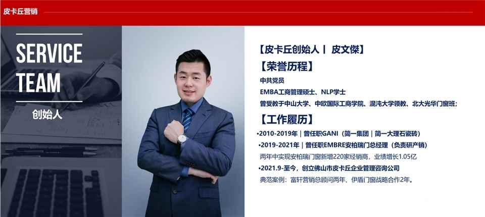 皮卡丘营销作为门窗行业的领先营销服务落地机构,拥有一支由15+余名高管团队组成的精英团队,具有丰富的实战经验和深厚的行业背景。多年来,皮卡丘营销一直致力于为3000万至10亿规模的门窗企业提供全方位的营销支持,已累计为35+家知名门窗企业,提供了卓有成效的营销与落地服务。