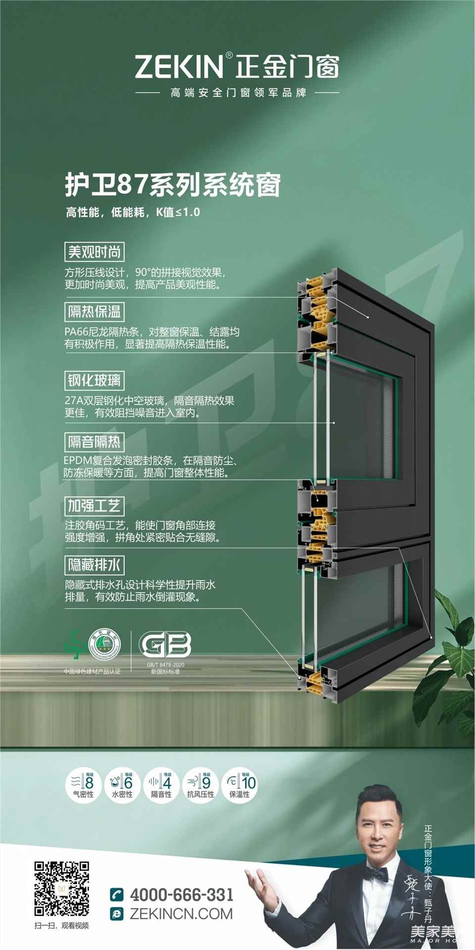 如K值降至1.0的「护卫87系列」,超越《铝合金门窗》GB/T8478-2020标准提出的“传热系数K值<2.5”的门窗保温隔热性能全新标准,帮助门窗有效降低家居对制热、制冷设备的依赖性,为消费者带来健康的品质人居环境。正金门窗同时自有产品研发团队和自建产品检测中心,积极开发绿色环保、持久可靠的高品质、低能耗系统门窗,为万千家庭带来绿色生活方式。