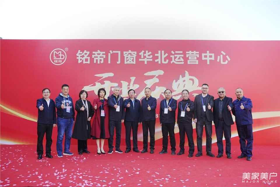 全联房地产商会常务副监事长、中国建筑节能协会候任副会长孟繁军,全联房地产商会节能门窗分会监事长、中国建筑节能协会系统门窗分会副主任、亚萨合莱国强(山东)五金科技有限公司董事、总经理李敬芳,系统门窗专家委员会执行主任、中国建筑节能协会系统门窗分会专家智库组长、泰诺风保泰(苏州)隔热材料有限公司总工程师刘军,全联房地产商会节能门窗分会副会长、中国建筑节能协会系统门窗分会副主任委员、铭帝集团有限公司总经理邓春平,铭帝门窗华北运营中心总经理杨启堂,铭帝门窗华北运营中心技术总监刘紫锋共同启动“铭帝门窗华北运营中心开业庆典”仪式。