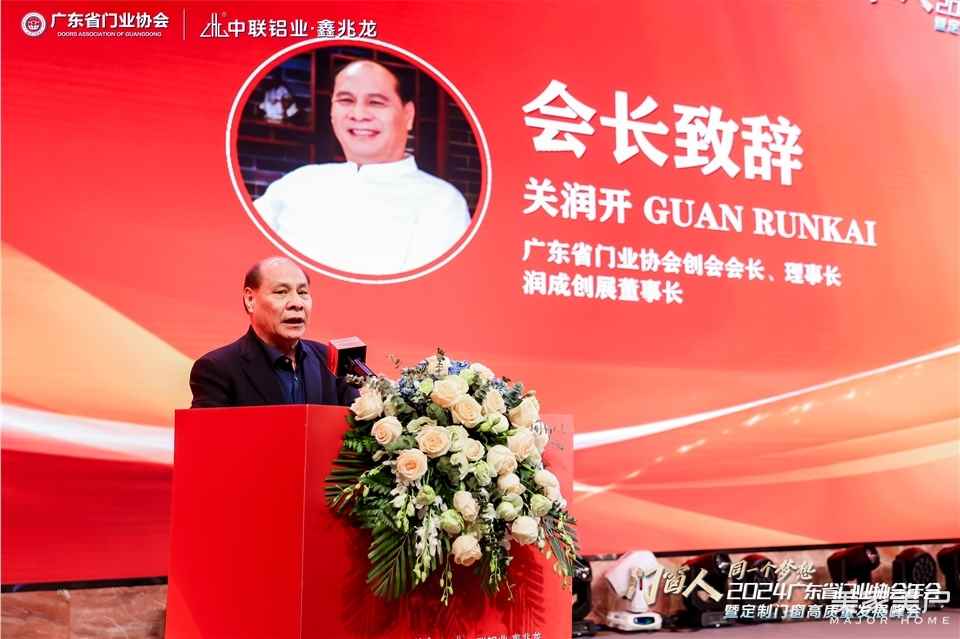 广东省门业协会创会会长、润成创展董事长关润开为晚宴致辞,他表示,“2024年,门窗行业遇到了市场下行、内卷、洗牌等巨大挑战和前所未有的困难。门窗企业要想实现可持续发展,一是要树立信心,找准时机,二是抱团前行。协会将搭建更多的服务平台,整合行业资源,携手会员企业抱团前行。”