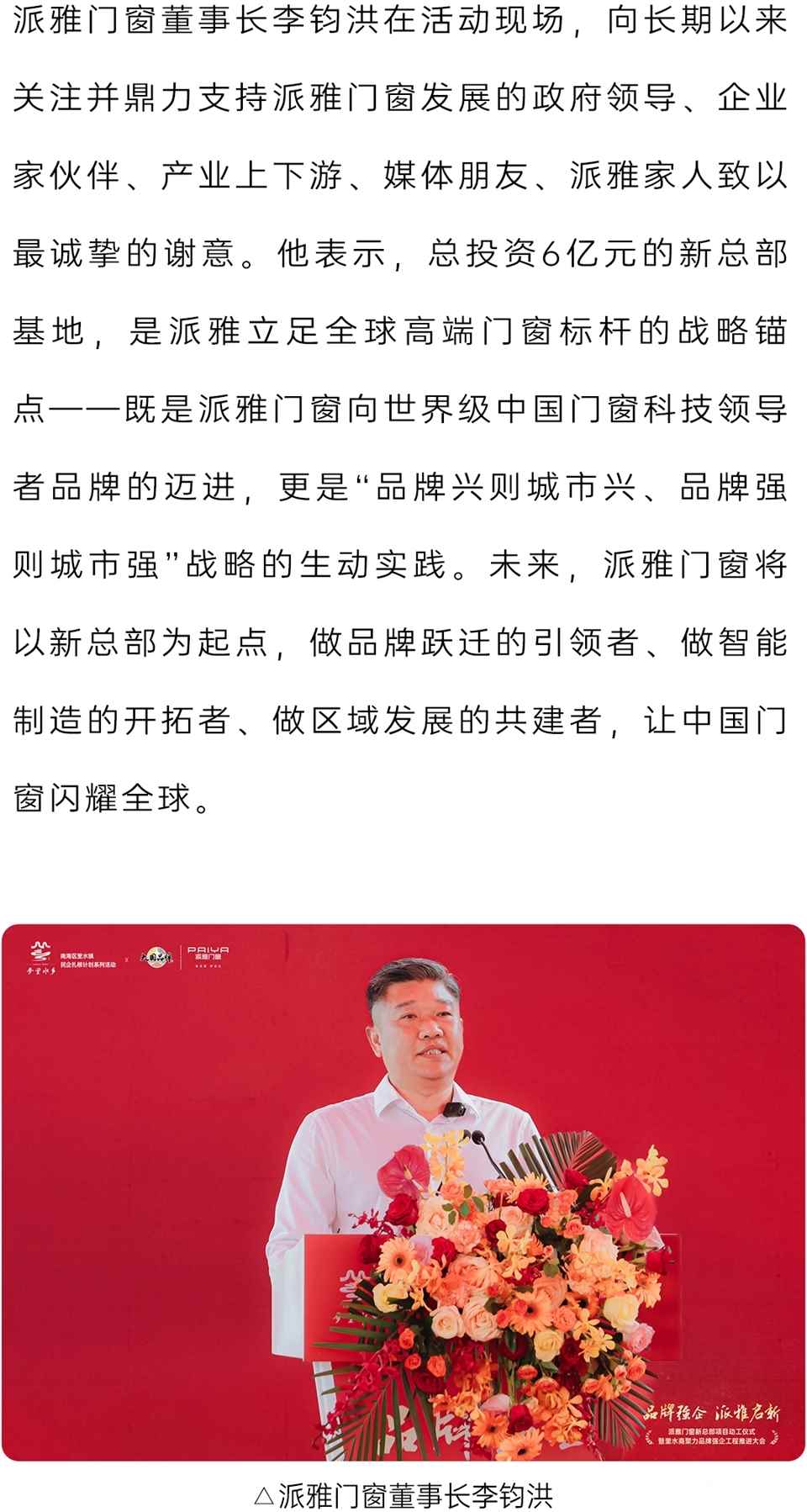7月14日,派雅门窗新总部项目动工仪式暨里水商聚力品牌强企工程推进大会在佛山里水隆重举行。新总部建筑面积15万㎡,年产能可达200万m²,是一座集高端铝合金系统门窗研发、制造、营销、服务于一体的综合性智慧产业园区,将作为派雅门窗的全新“智慧大脑”,驱动品牌高端化战略发展。