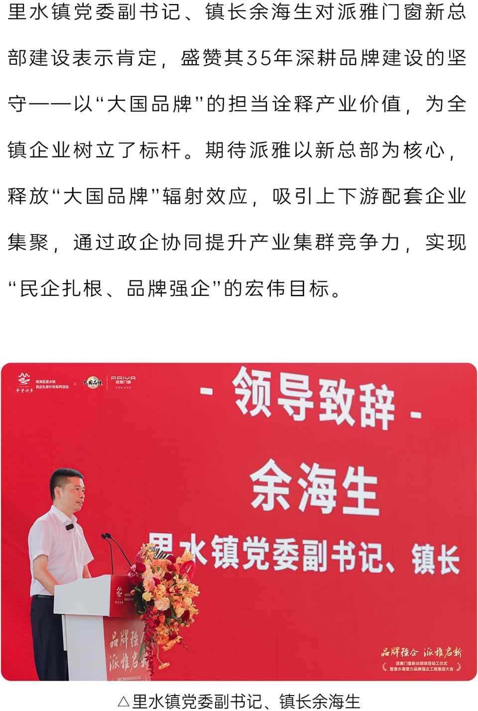 在政府领导和产业上下游优秀代表企业的见证下,“品牌聚势•冠军领航”里水镇企业品牌跃升计划正式启动,同期,里水镇政府对一批在品牌建设、产业研发、国际拓展、产业贡献等领域表现卓越的“里水品牌力量典范企业”进行表彰,派雅门窗荣获「佛山标准产品」荣誉。与此同时,派雅门窗董事长李钧洪与品牌联盟董事长、中国品牌节主席王永共同签署战略合作协议。