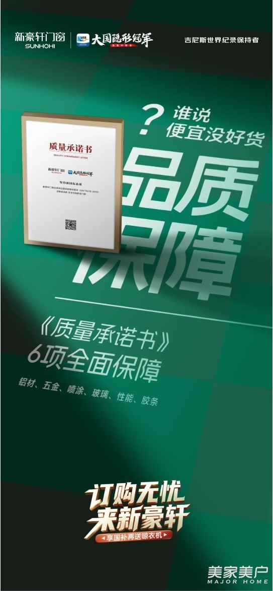 订购无忧险的发布,不仅切实维护消费者的权益体验,再次彰显新豪轩门窗的冠军担当,更推动门窗消费从「赌商家良心」进入「靠规则保障」的新阶段,为行业建立了「消费信任体系」的范本。