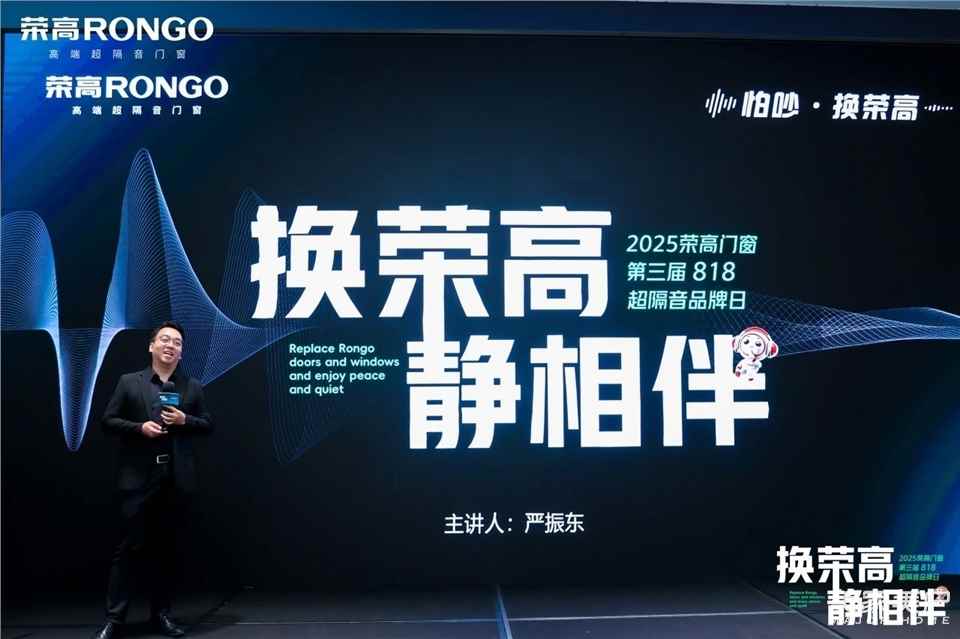 随后,荣高门窗副总裁黄嘉鸿先生登台,作《换荣高·静相伴》主题演讲,正式揭晓品牌全新战略升级。黄嘉鸿深入阐述了荣高洞察到的“静音需求觉醒”时代背景,以及品牌聚焦“超隔音”赛道的决心与路径。他强调,荣高将通过持续的研发投入、严苛的制造标准、专业的声学设计,将“超隔音”打造成品牌最核心的DNA和最鲜明的标签。演讲的高潮,是全新品牌广告语“怕吵·换荣高”的震撼发布。这句口号简洁、有力、直击人心,不仅是对产品核心卖点的精准提炼,更是向消费者传递了一个清晰且极具行动号召力的解决方案——选择荣高,即是选择告别噪音困扰,拥抱宁静生活。