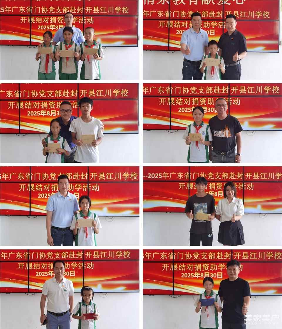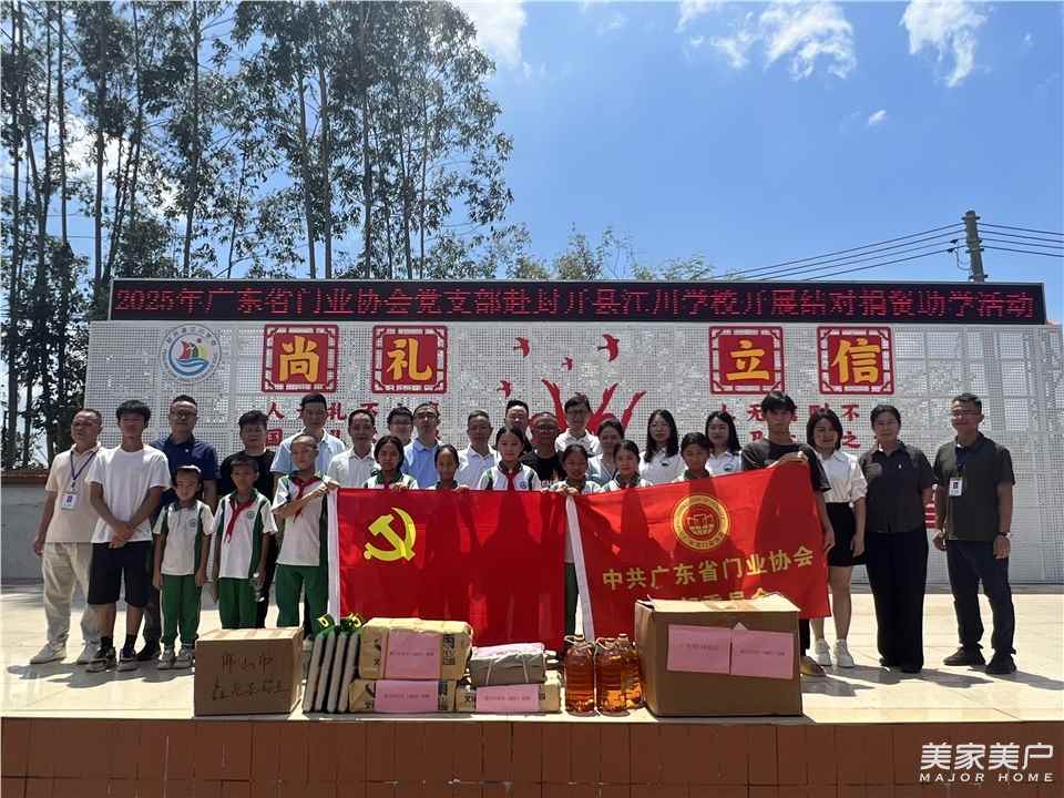自2022年首次走进广东省肇庆市封开县江川学校以来,广东省门业协会始终将“教育帮扶”作为践行社会责任的重要抓手。2025年8月30日,协会党支部联动多家爱心会员企业代表第四次奔赴江川学校,开展“结对捐资助学”活动,向11名困难家庭孩子发放助学金3.8万元,向学校捐赠近400册课外读物以及实用的体育用品,以务实行动,助力乡村教育发展。