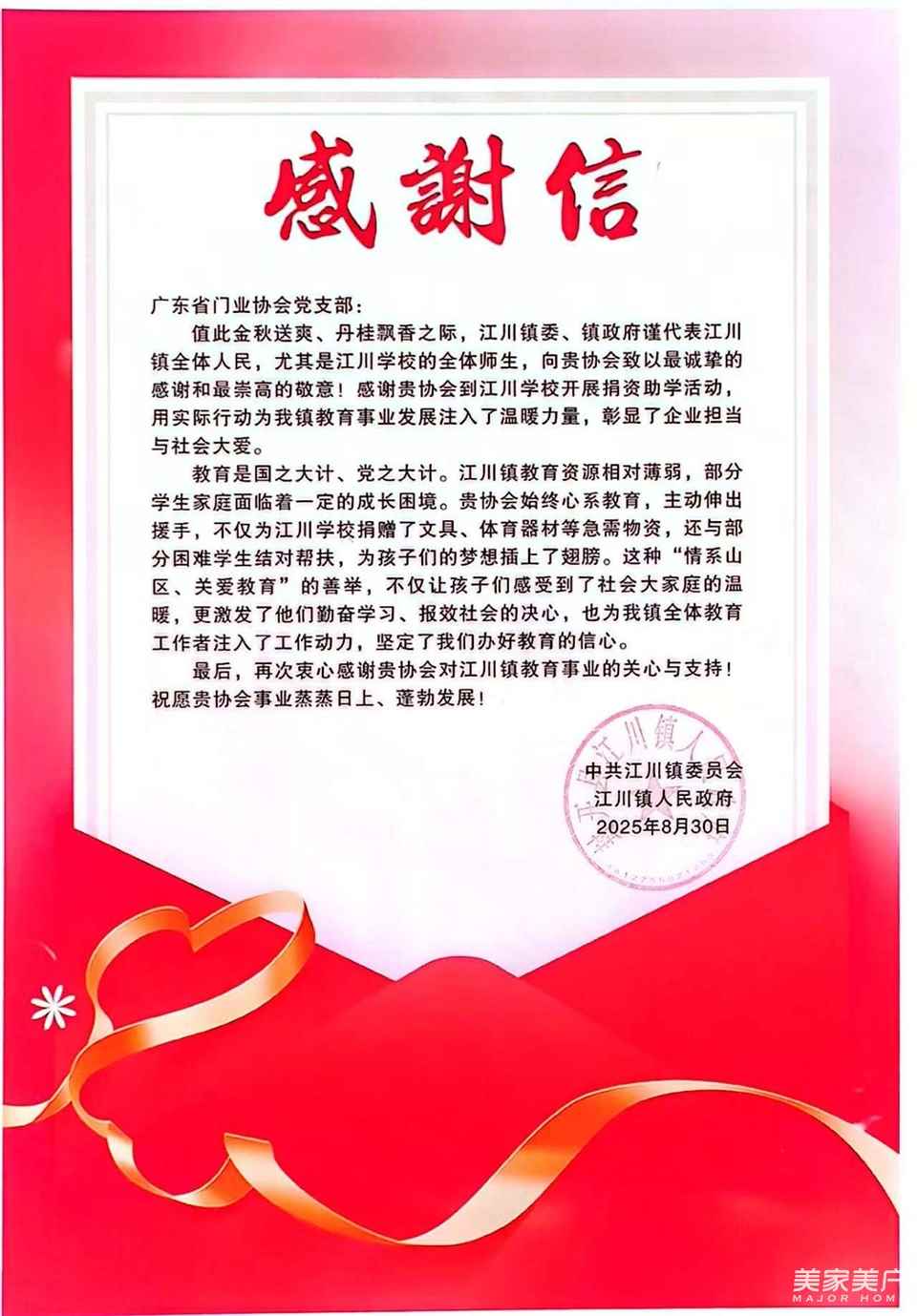 三年来,广东省门业协会及会员企业用持续的行动诠释了社会责任的内涵,展现了门窗行业及企业的温度与担当。从资金援助到物资支持,从校园改善到家庭走访,他们的爱心助学行动正在为封开县的孩子们筑起一条坚实的成长之路。