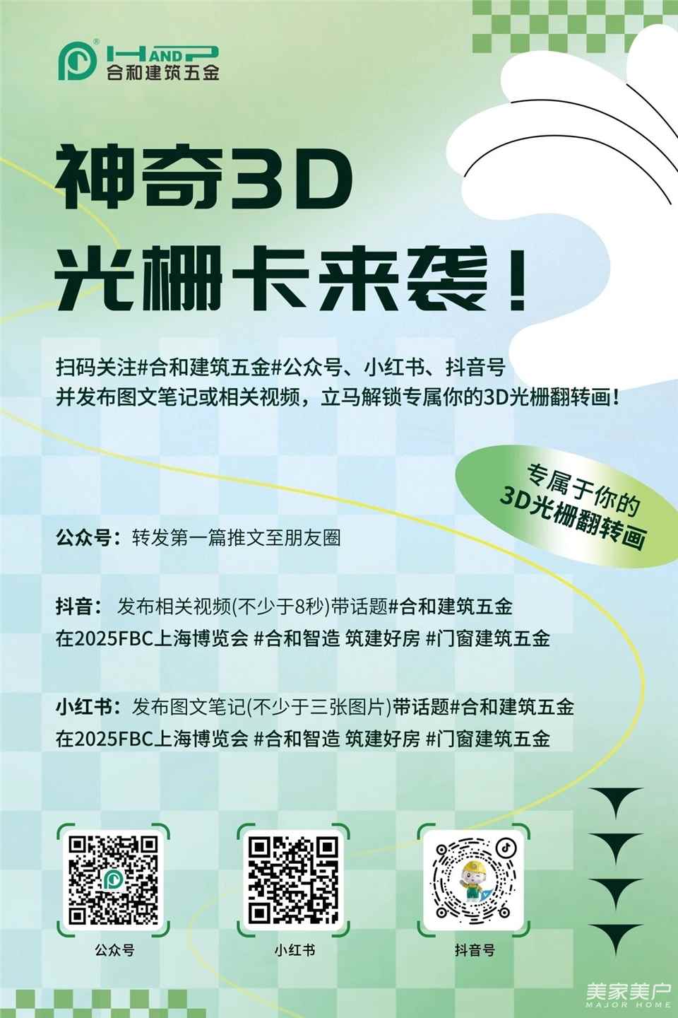 11月5日至8日在W1馆202合和建筑五金展位现场,只需关注合和建筑五金公众号、小红书、抖音号并发布相关内容,即可解锁专属3D光栅翻转画,体验科技与艺术的完美融合。