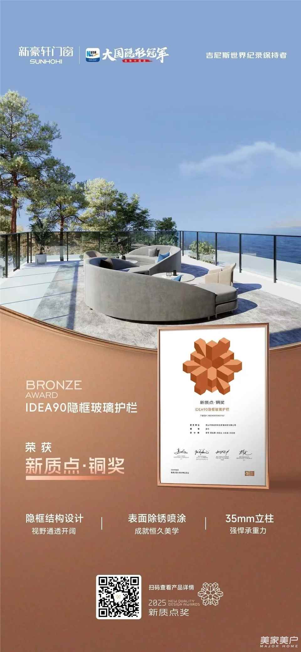 近日2025新质点设计奖颁奖典礼于北京清华科技园阳光厅隆重举行,新豪轩门窗凭借创新工艺和具备时代价值的产品设计脱颖而出,成为业内首家获奖品牌,其中IDEA90隐框玻璃护栏荣获新质点·铜奖,IDEA05智能极窄门、Edge50智能阳光房、天际系列执手斩获新质点奖。这份荣誉不仅见证了新豪轩门窗在设计领域的卓越实力,更体现了中国家居对产品设计价值的全新认知与追求。