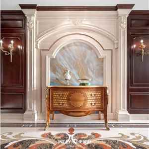 Artistic Narratives in CarvingThe entry cabinet’s motif is hand-carved by Wiley’s master craftsmen using both high relief and openwork techniques, with each floral form drafted at a 1:1 scale and carved to millimeter-level precision for dimensional symmetry and a warm, handcrafted depth. The transition between the marble Roman column and the solid wood wall panel uses a pre-embedded metal anchor and solid wood tongue-and-groove structure, with rust-resistant fittings set into the marble and hand-polished wood trim completing a seamless, naturally integrated meeting of materials.