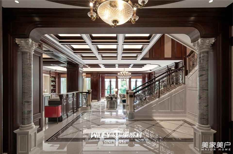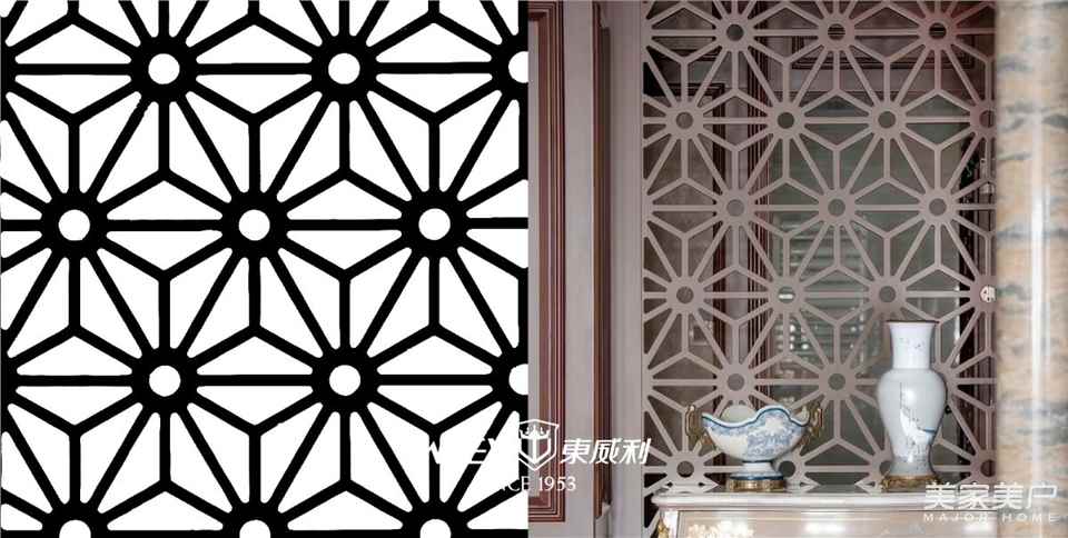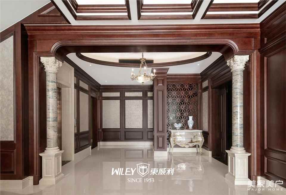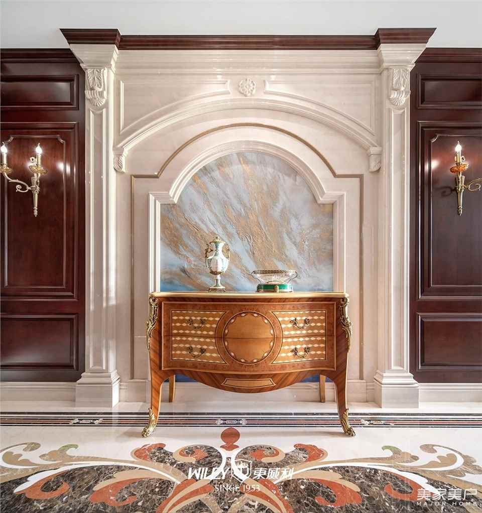 玄关柜饰纹由东威利资深雕刻师手工创作,采用“深浮雕 + 镂空雕”技法。花型1:1纸样放样,以毫米级精度控制刀深与角度,确保花纹对称立体,细节中彰显工艺温度。大理石罗马柱与实木护墙衔接采用“金属预埋件 + 实木企口”工艺。在大理石柱基植入防锈金属件,再与实木榫槽精准咬合,最后手工打磨实木线条收边,实现两种材质牢固自然的拼接。