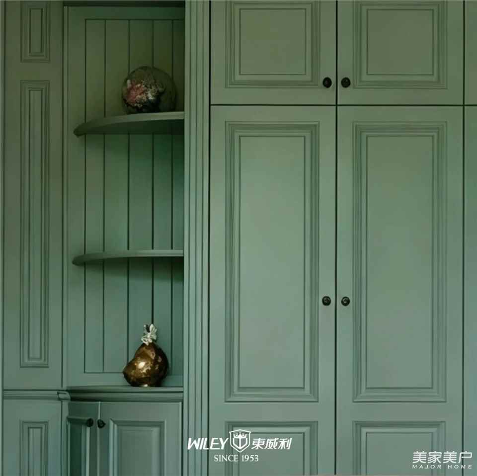 柜体的莫兰迪绿采用东威利“七底三面”涂装工艺。先以渗透性封闭底漆锁住实木管孔,再经三次色漆层叠,最后以哑光清漆罩面,呈现丝绒般细腻感。色彩通过色浆精准调配与多层晕染,复古而柔和。